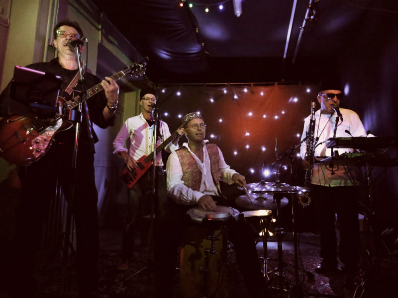 Aufbauen plugged (hier an einem WG-Fest) inklusive PA, Schlagzeug, Bühnenlicht, Rauchmaschine... dauert nicht 40 Minuten sondern nur 20 Sekunden, Balkan EXPRESS, yeah!